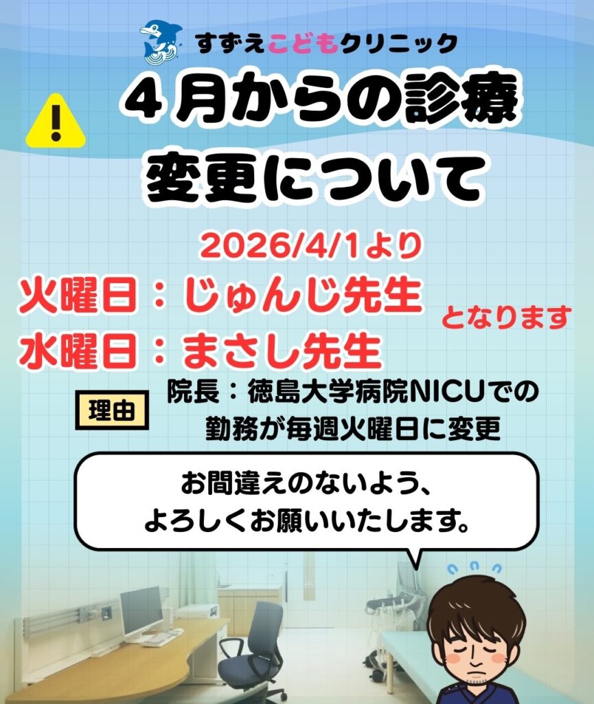 2026.03.24 🐬4月からの外来担当医変更について🐬 4月1日より曜日毎の診察医が一部変更になります。 火曜日:じゅんじ先生 水曜日:まさし先生 に変更になりますのでお間違えのないようよろしくお願いいたします。 < 一覧へ戻る > アーカイブ ・2026.03(2)・2026.02(1)・2025.10(1)・2025.09(1)