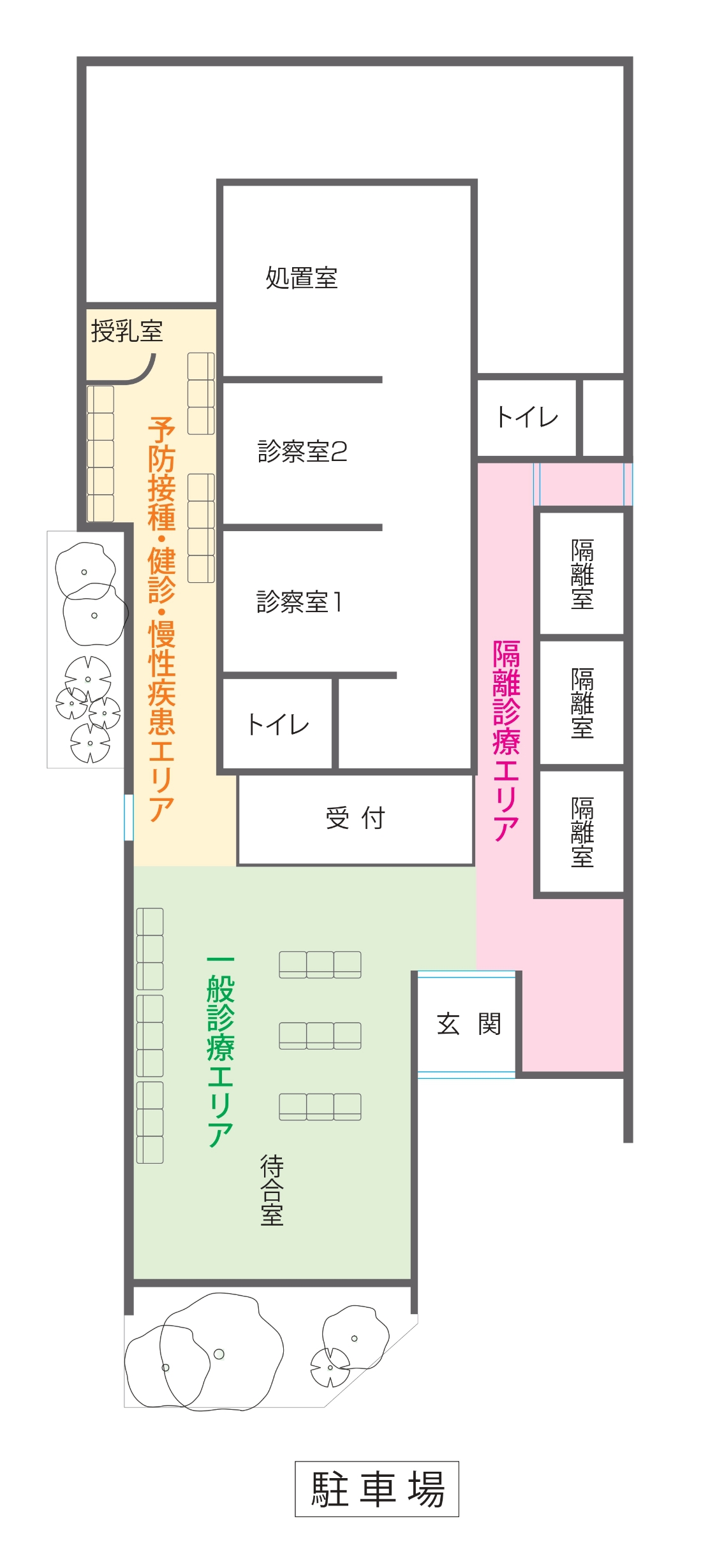 予防接種エリアへの裏口、隔離診察エリアへの裏口があり、院内感染を限りなく0に近づけ、